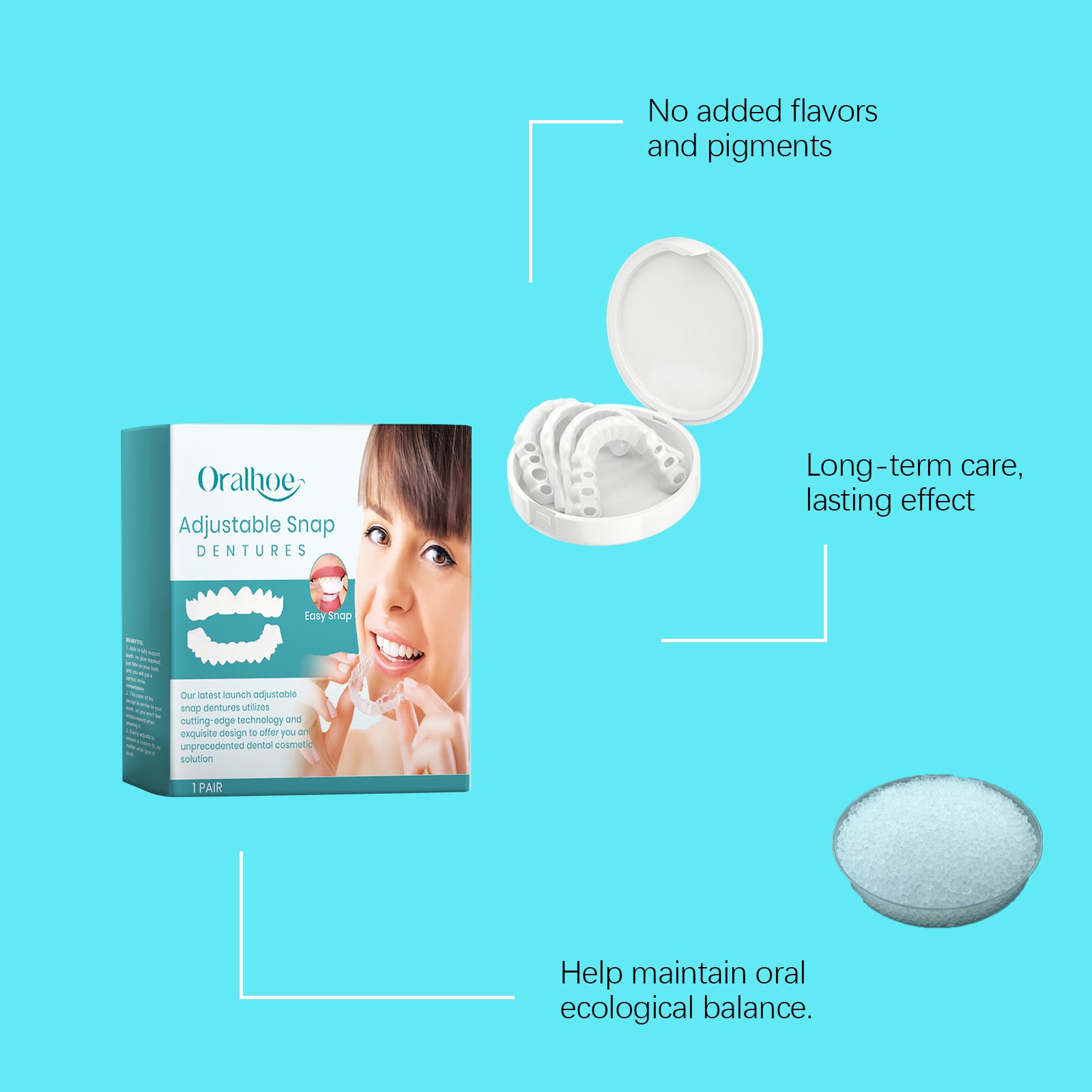 Our adjustable buckle dentures contain silicone. It can protect your teeth. Its use method is very simple: first soften the dentures with hot water, wear the softened dentures in your mouth, adjust the dentures by clenching your teeth, and cool the dentures in cold water. And can be a variety of sizes to meet individual needs.