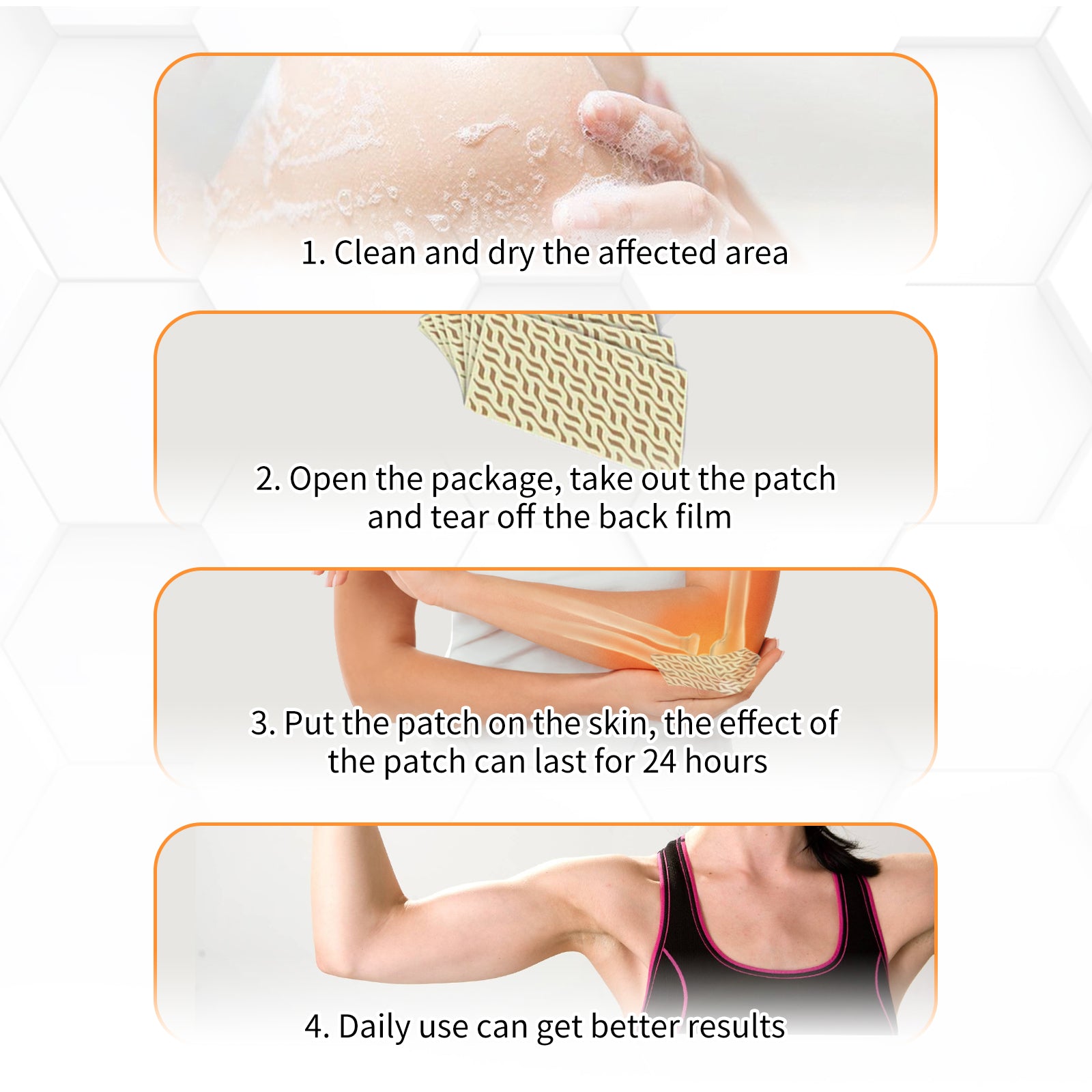 Our joint care strips contain arnica flower extract, methylsulfonyl methane. It penetrates the skin deep into joints and muscles, providing comfortable warmth. Its use is simple: 1. Clean and dry the affected area. 2. Open the package, take out the patch, and tear off the back film. 3. Apply the patch to the skin, and the effect of the patch can last for 24 hours. 4. Daily use can get better results. It can also protect joints and relieve discomfort in time.