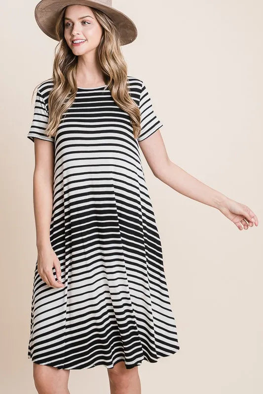 The Casual Stripe Round Neck Tee Dress is a versatile and effortless piece for everyday wear. With classic stripe detailing, this dress offers a casual and chic look. Featuring a comfortable round neck and soft fabric, it is perfect for running errands or casual outings. Update your wardrobe with this stylish and easy-to-wear tee dress.