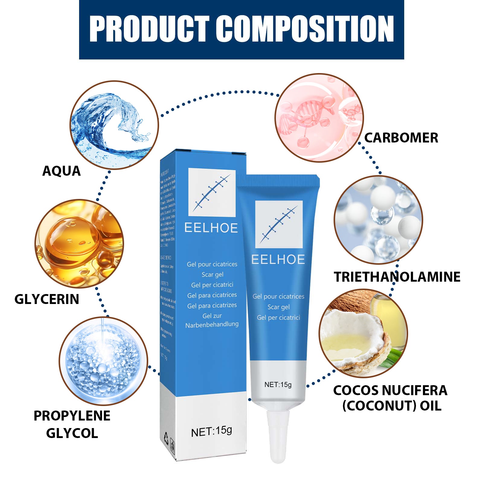 Our scar healing gel contains glycerin, propylene glycol, carbomer. It helps fade the scars. Its use method is very simple: 1. Open the cover of the product, carefully clean the scar area, and dry the scar area. 2. Gently apply the product to the scar area and evenly apply the product to the scar area. 3. After the product dries, use twice a day. Gentle and non-irritating after use, it moisturizes skin, softens scar tissue, controls scar regeneration, promotes skin metabolism, improves, heals and reduces scars.