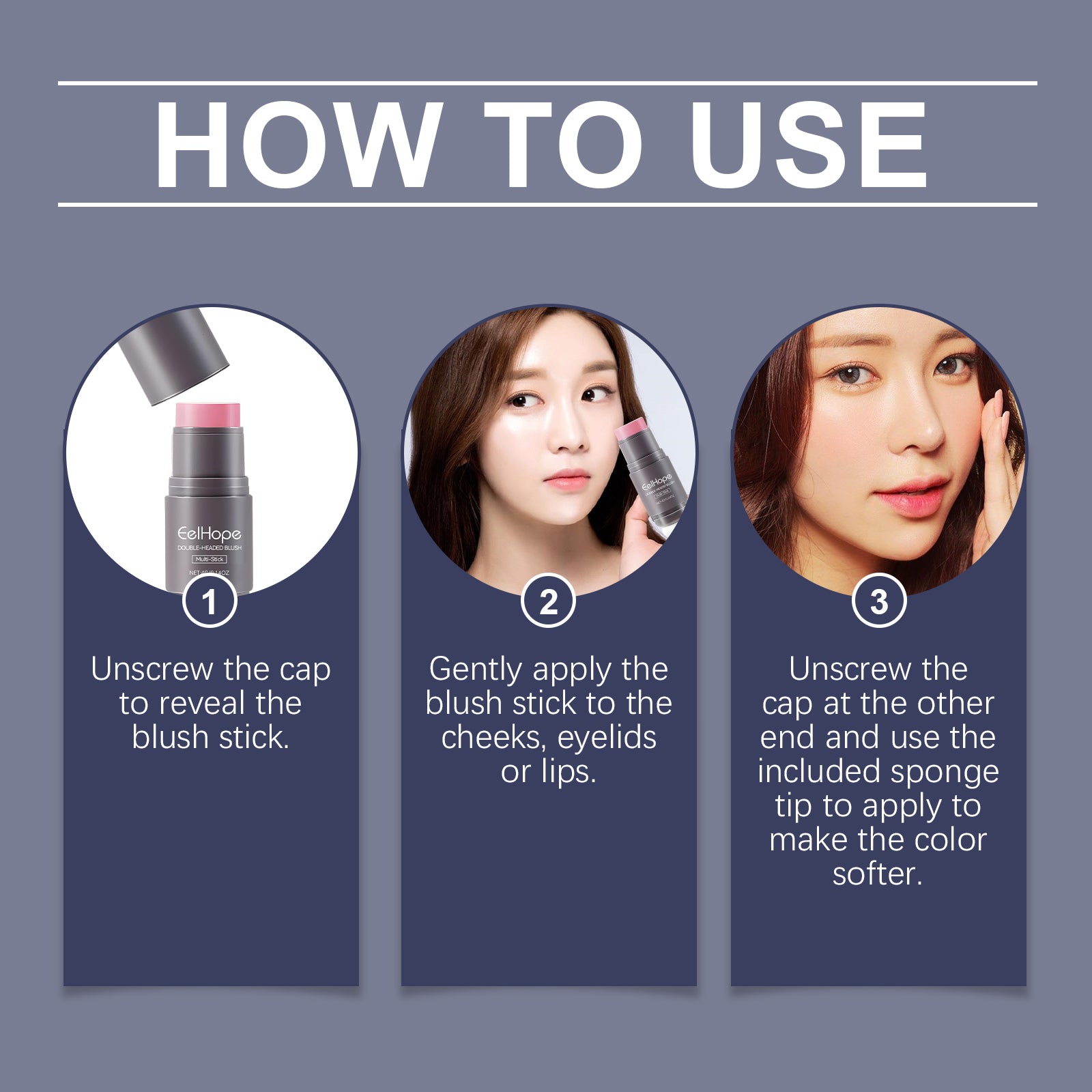 Our two-ended blush multi-purpose bar contains hyaluronic acid and vitamin E. It guarantees a matte, dewy facial shine without any stickiness. Its application is simple: unscrew the lid to reveal the blush stick, gently apply the blush stick to your cheeks, eyelids or lips, unscrew the lid at the other end and apply with the included sponge tip for a softer color. And it's perfect for getting a touch up on the go or maintaining a polished look while traveling.