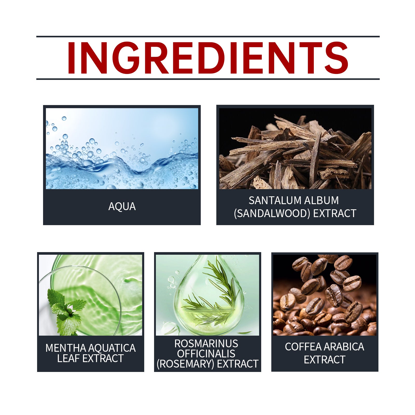 Our facial hair spray contains rosemary extract, coffee extract. It moisturizes the beard and surrounding skin. Its use method is very simple: first clean and dry the skin area where the beard grows, take an appropriate amount of this product on the skin area where the beard grows, and gently massage with your hand to promote absorption. It can also deeply clean, prevent pores from clogging, and make whiskers healthier.