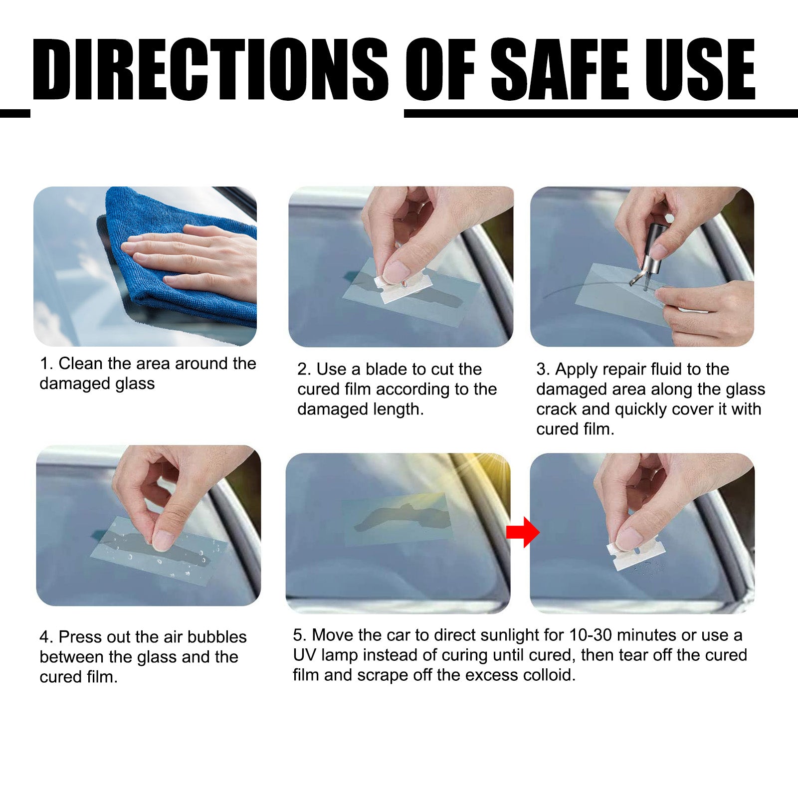 Our Glass Repair Kit contain isopropyl alcohol, propanediol butyl ether and lauryl ether 7. It can repair the cracks, stone impact marks and other damage on the windproof glass, so that the glass can restore the original beauty and strength, and reduce safety hazards. Its use is simple: Clean the area around the damaged glass, cut the cured film with a blade according to the broken length, apply the repair solution along the damaged area of the glass crack and quickly cover with the cured film, press out the bubbles between the glass and the cured film, move the car to direct sunlight for 10-30 minutes or use ultraviolet lamp instead of curing until curing, then tear off the cured film and scrape off the excess colloids. The ingredients of this product are safe, no harm to the human body, so that you are more assured when using, the repaired glass surface is smooth and smooth, and can maintain the repair effect for a long time.