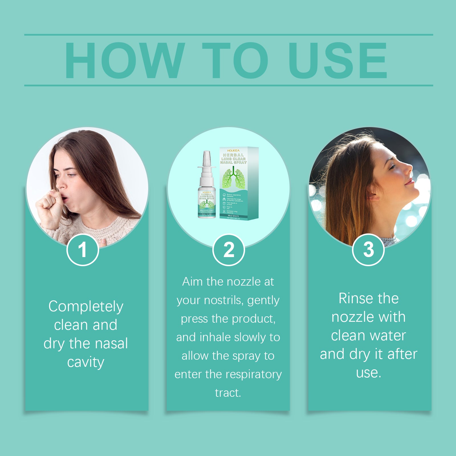 Our herbal nasal spray contains glycerin, panthenol, and PCA sodium. It can effectively relieve respiratory discomfort and promote good health. Quickly and efficiently remove mucus from the lungs and trachea. Its use method is very simple: 1. Thoroughly clean and dry the nasal cavity; 2. Point the nozzle at your nostril, gently press the product, and slowly inhale to allow the spray to enter your respiratory tract. 3. Rinse the nozzle with clean water and wipe dry after use. Helps reduce breathing resistance and improve breathing comfort.
