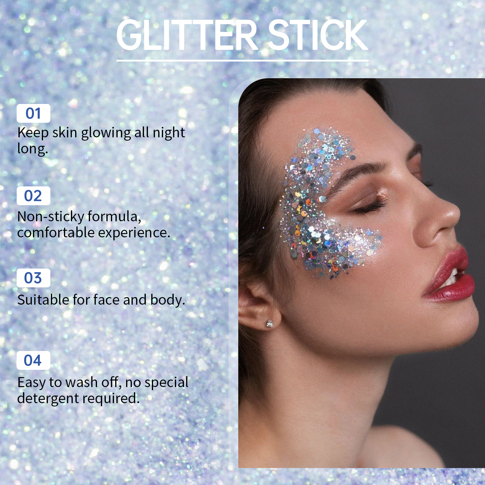 Our sequin flash rods (blue) are carefully formulated with glycerin, carbomer and mica. Designed specifically to enhance skin luster and keep sequins shiny and charming for a long time. The usage method is extremely convenient: 1. Open the lid, rotate the top knob, and unscrew the paste. 2. Apply the sequin stick evenly and directly to the body, hair, face, including the skin around the eyes and other areas you want to decorate. And add shiny mica to instantly enhance your personal charm; Suitable for all kinds of social occasions and for sensitive skin.