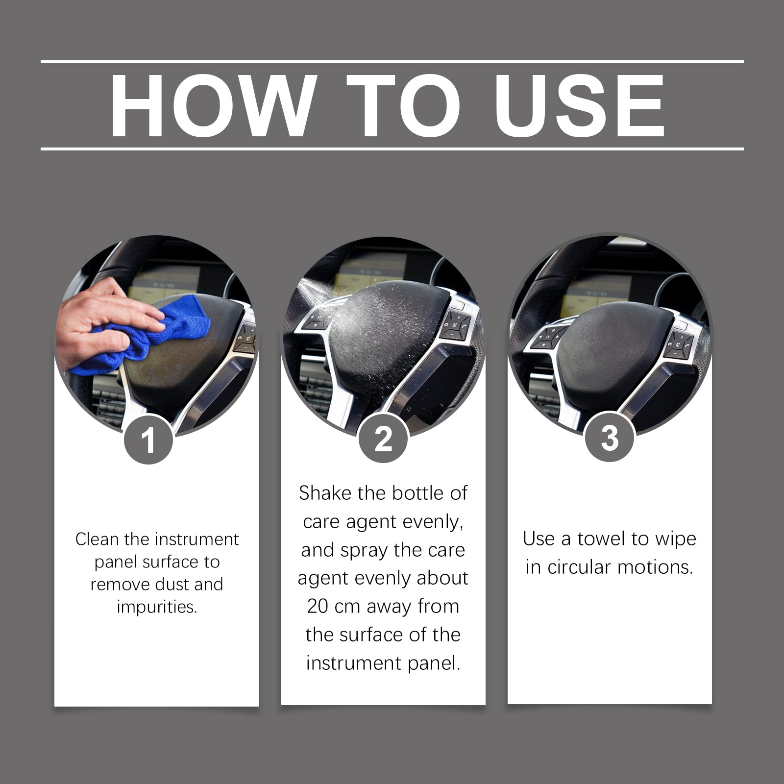 Our instrument panel leather polishing agent contains polymethyl methacrylate and silicone resin. It improves the appearance of the interior and contains durable protection against daily wear, UV damage and environmental aging, extending the service life of interior components. Its use method is very simple: clean the surface of the instrument panel to remove dust and impurities, shake the bottle of care agent, and evenly spray the care agent about 20 cm away from the surface of the instrument panel. Rub the towel in a circular motion. And yes, make sure the inside surface does not feel greasy and dry after use.